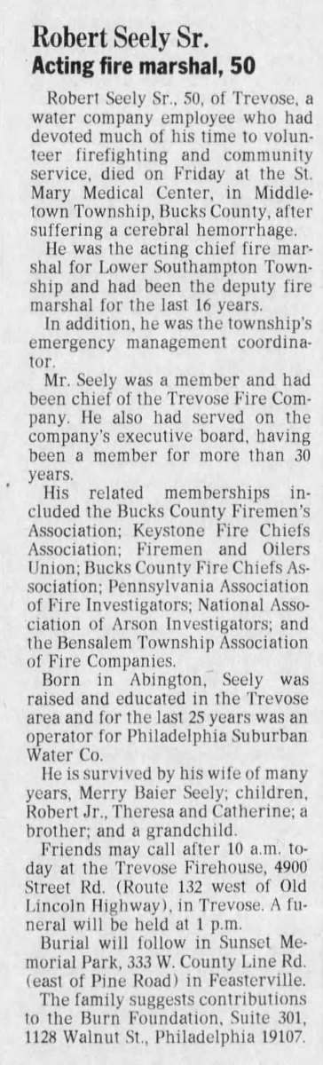 Bob Seely was a good friend of mine and one of our "small gang" living in Trevose. Most of us were class of '66 so Bob was the youngest. As we all turned 16, we joined the Trevose Volunteer Fire Company. During the early years he was a fire fighter and later became part of the fire police serving for around 25 years.Bob bought a house on Clarke Ave in Trevose within walking distance of his parents and as best as I remember, he only ever had one job, working for the water company which is where he also passed away sitting at his desk. Bob was married to Merry Seely and had a couple of children but we lost touch after 1981 when I moved to VA.